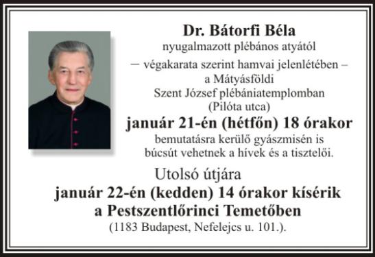 2019. január 8-án elhunyt dr. Bátorfi Béla érseki tanácsos, pápai prelátus, a Mátyásföldi Szent József Plébánia nyugalmazott plébánosa, kerületünk díszpolgára.