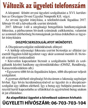 A központi felnőtt orvosi ügyeleti szolgáltatást a XVI. kerületben az Országos Orvosi Ügyelet Nonprofit Kft. végzi.