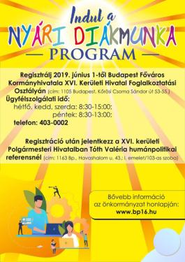 Budapest Főváros XVI. kerületi Önkormányzat idén is bekapcsolódik a programba, elősegítve ezzel a kerületben állandó lakhellyel vagy tartózkodási hellyel rendelkező, 16-25 év közötti, nappali tagozatos diákok adminisztratív vagy könnyű fizikai munkára történő nyári foglalkoztatását.