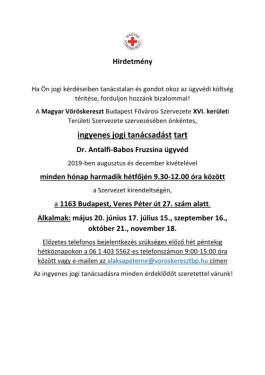 A Magyar Vöröskereszt Budapest Fővárosi Szervezete XVI. kerületi Területi Szervezete szervezésében önkéntes ingyenes jogi tanácsadást tart.