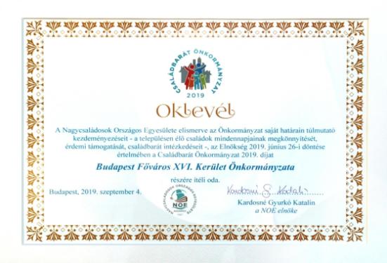 Szeptember 4-én a Parlament Vadásztermében ismét elismerésben részesítették azokat az önkormányzatokat, amelyek intézkedéseik, rendeleteik és fejlesztéseik megtervezésekor figyelembe veszik a családok, és a munkába járó édesanyák érdekeit is. A XVI. kerület Önkormányzata már negyedik alkalommal részesült a Családbarát Önkormányzat Díjban.A Nagycsaládosok Országos Egyesülete meghatározónak tartja az önkormányzatok szerepét abban, hogy a családok mindennapi életéhez szép környezet, jól felszerelt intézmények és színvonalas infrastruktúra álljon rendelkezésre. Azoknak az önkormányzatoknak az elismerésére, amelyek sokat tesznek ezért, létre hozták a Családbarát Önkormányzat Díjat, amelyet igazán elegáns és ünnepélyes körülmények között vehettek át a díjazottak.