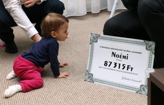 A 16 hónapos Noémi 700 grammal, 36 centiméteres testmérettel született. Élete második napján kétoldali agyvérzést szenvedett, baloldali szívkamra nagyobbodást is megállapítottak nála, majd még hatszoros tűdő- és kétszeres gyomorvérzés következett. Túl van már egy szemműtéten is, és a felsoroltak miatt rendszeres utókezelésekre szorul. Rendkívüli életerejének köszönhetően mégis van rá remény, hogy utolérje szerencsésebb társait. Van hát helye az anyagi segítségnek, amelyet a szülők ezúton is hálásan köszönnek a kupakgyűjtőknek. Drukkoljunk együtt Noéminek, hogy minden jóra forduljon!