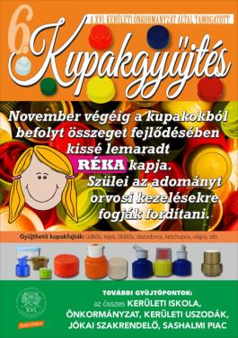 Kupakgyűjtési akciót hirdetünk ismét egy kerületi kislány Réka javára. Határidő: november vége.