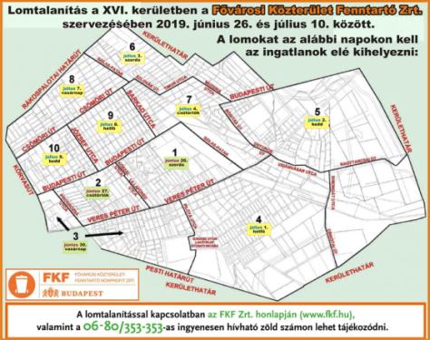 Lomtalanítás a XVI. kerületben az FKF Zrt. szervezésében a 2019. június 26-a és 2019. július 10-e közötti időszakban. Amennyiben további kérdésük van keressék fel az FKF Zrt. honlapját vagy hívják az ingyenes zöldszámukat (06-80-3535-353).
