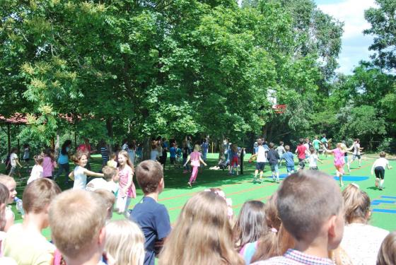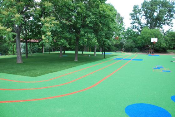 Korábban az udvarnak ezen a részén az iskola diákjai rossz állapotú balesetveszélyes aszfalton voltak kénytelenek a szüneteket eltölteni. Az udvar közepén található fák gyökerei az esőzések következtében mindig kimosódtak, ezért erre a problémára megoldást kellett találni. Így az önkormányzat egy speciális udvar kialakítását határozta el. A probléma megoldásával az önkormányzat a Holland Pázsit Kft-t bízta meg, akik egy olyan felülettel burkolták le az udvar problémás területét, amely nem pusztán dekoratív és tartós, hanem a burkolat alatti vastag zúzottkő réteg a terület további erózióját is megállítja és a zöld felületen elszikkasztja a csapadékvizet. Szász József alpolgármester elmondta, hogy a cégnek kerületen belül ez az első munkája, amit referenciául szánt, hiszen ha beválik, akkor az önkormányzat több kerületi óvodában is kialakíthat majd a jövőben ilyen játszóudvart. Amint a képeken is látszik az iskola diákjai nagy örömmel vették birtokba az új udvart.