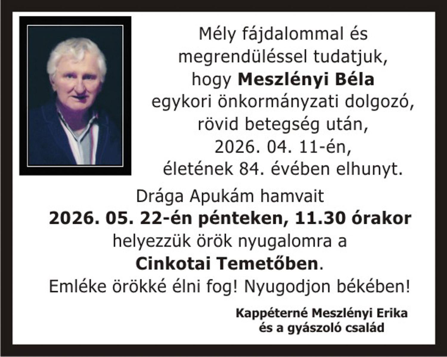 Mély fájdalommal és megrendüléssel tudatjuk, hogy Meszlényi Béla, egykori önkormányzati dolgozó, rövid betegség után, 2026.04.11-én életének 84. életévében elhunyt.