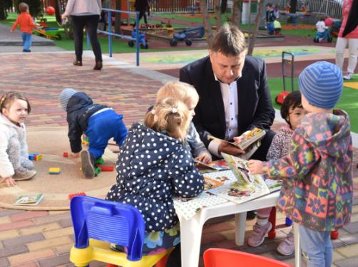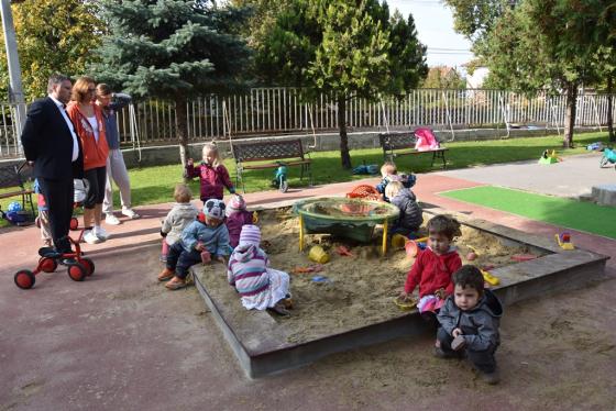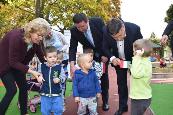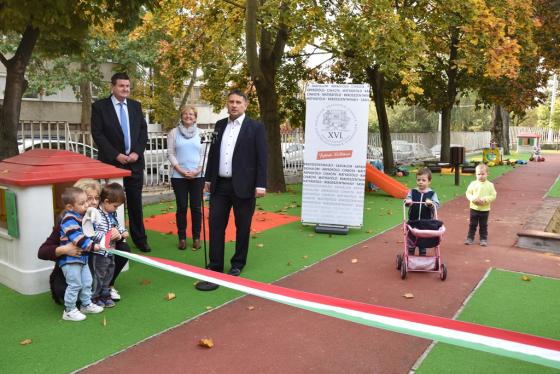 A Fejlődő Kertváros Program újabb pontja valósult meg. Idén nyáron megszépült 30 millió forintból a Kolozs utcai Bóbita bölcsőde udvara. 650 négyzetméter műfű, 110 négyzetméter gyepesítés automata locsolóhálózattal, 120 négyzetméter térkő beépítésével, modern és hosszútávon fenntartható udvar jött létre. Színes, vidám hangulatú műfüvön szaladgálhatnak, vonatozhatnak, hintázhatnak, sőt, még megújult homokozókban is játszhatnak a gyerekek. Kovács Péter polgármester és Dr. Csomor Ervin alpolgármester megköszönte az óvoda munkatársainak, a szülőknek és a kicsiknek, hogy türelemmel viselték a beruházás okozta kellemetlenségeket. Emellett elismeréssel szólt a Holland Pázsit Kft.-ről, amely nemcsak ezt, hanem a múlt héten átadott Táncsics Mihály Általános Iskola udvarát is széppé varázsolta. Csomor alpolgármester úr beszélt az önkormányzat bölcsődebővítési terveiről is.
