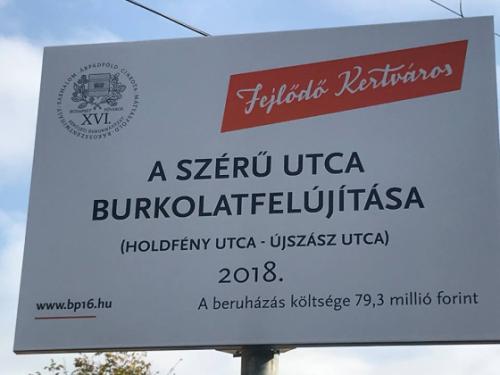 Elkészült a Szérű utca útfelújítása, a beruházás értéke közel 80 millió forint. Nem csak az aszfaltút, de a csapadékvíz elvezető árok és a járda is megújult. Mindig öröm, ha a közbeszerzésen XVI. kerületi a kivitelező nyer, mert jó minőségben, határidőre dolgoznak, ezért köszönet a Rok-La Kft-nek.