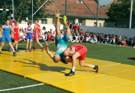 Dr. Jakabházyné Mező Mária elmondta: nem meglepő, hogy a rákosszentmihályi iskolában már a második műfüves pálya készült el, hiszen a XVI. kerület vezetése példamutatóan nagy gondot fordít a sportra, illetve azokra az intézményekre, ahol a testmozgás és az egészségre való nevelés nagy hangsúlyt kap. Dr. Csomor Ervin azt emelte ki, hogy ezzel az eseménnyel lezárult az Önkormányzat és a Magyar Labdarúgó Szövetség közös programja, amelynek eredményeként már minden olyan önkormányzati működtetésű iskolában van műfüves pálya, ahol ezek kialakítására lehetőség volt. Szatmáry László arra emlékeztette a jelenlévőket, hogy Rákosszentmihályon nagy hagyománya van a labdarúgásnak, hiszen a helyi csapat, a RAFC a közelmúltban ünnepelte alapításának 100. évfordulóját. Az új pálya pedig azért is nagy öröm, mert így az évszázados hagyomány folytatódhat, és új tehetségeket fedezhetnek fel más sportágak mellett a labdarúgás számára is. Majsai Károly arról beszélt, hogy mindenkiből lehet olimpiai bajnok, aki elég elszánt, sokat és szorgalmasan edz, ehhez pedig kitűnő helyszín egy ilyen műfüves pálya. Reményei szerint a jelen lévő diákok között is lesznek olyanok, akik átélhetik azt a nagyszerű érzést, hogy milyen az olimpiai dobogón állni. A vendégek üdvözlő szavai után a tanulók egy csoportja röviden ismertette az iskola névadójának, Szent-Györgyi Albertnek életútját. Ezután egy vetélkedő keretében az osztályoknak a kertben elrejtett kártyákat kellett megkeresniük, amelyeken egy-egy vitamint, vagy Szent-Györgyi professzor monogramját jelölték. Végül a megtalált betűket a tanulóknak kellett megjeleníteniük. A felavatott pályán Osváth Gréti fitnesz-, majd Száraz Nesztor tornagyakorlatokat mutatott be, a Kertvárosi SE birkózói ízelítőt tartottak a legősibb küzdősport mesterfogásaiból, a diákok egy csoportja pedig egy koreografált focitáncot adott elő. Végül kezdetét vette a körmérkőzéses labdarúgó bajnokság, ahol a csapatok barátságos mérkőzéseket játszottak, így mindenki nyertes volt. » Mészáros Tibor - XVI. Kerületi Újság