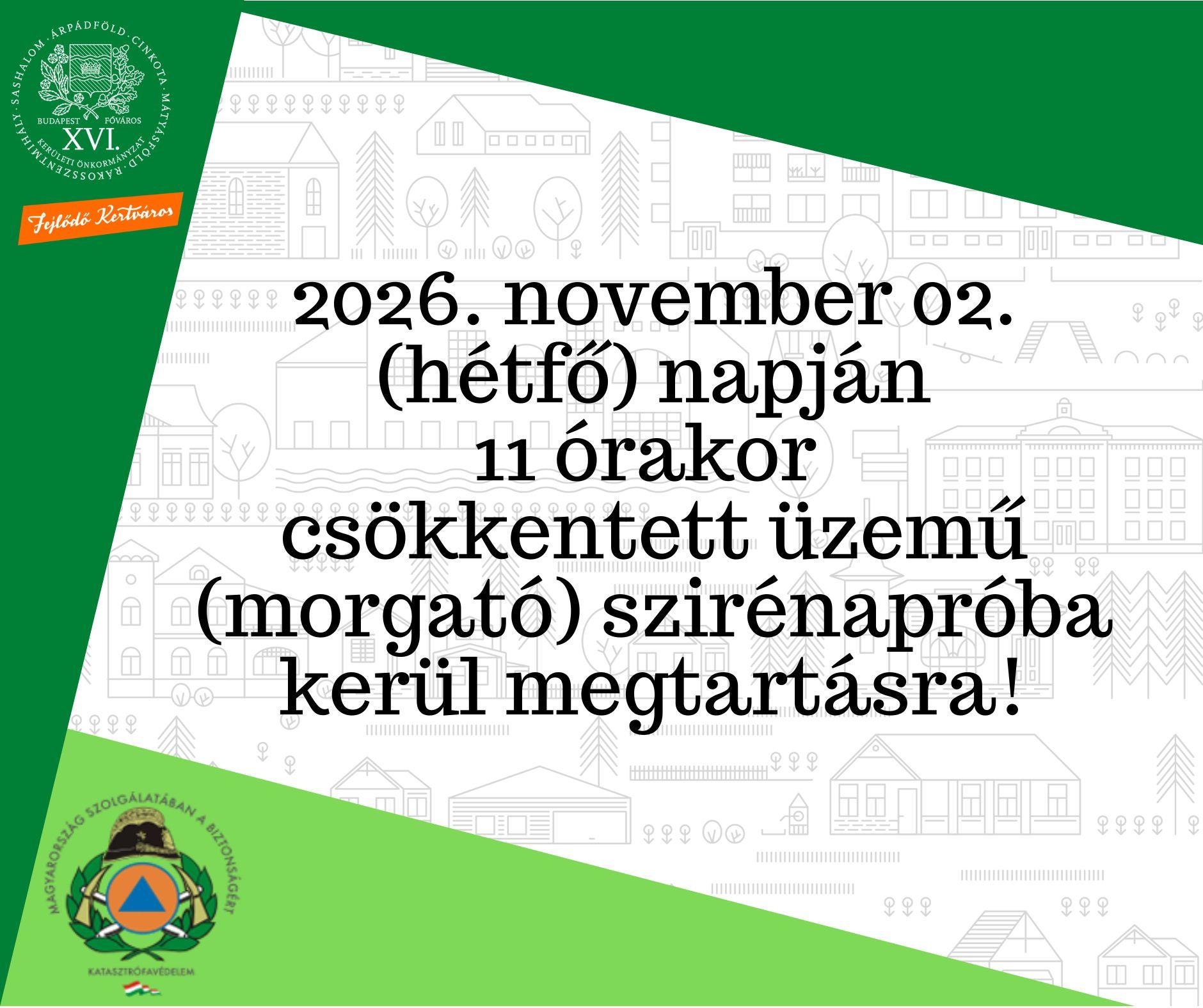 2026. november 02-án, hétfőn, 11 órakor csökkentett üzemű (morgató) sziréna próba kerül megtartásra.