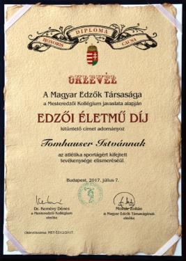 Tomhauser István pályafutása azonban még nem fejeződött be, hiszen ma is aktív edzője az Ikarus Atlétikai Szakosztálynak. Így elképzelhető, hogy az eddigi 40 érem, oklevél, elismerés és kitüntetés a jövőben még szaporodik.
