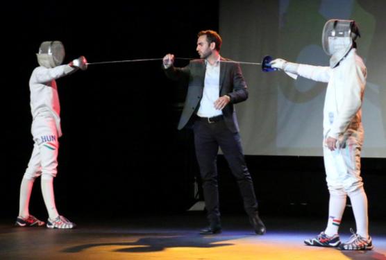 Az élménybeszámolók után Áron és András bemutatták, hogyan szoktak iskolázni, majd történelmi pillanatnak lehetett tanúja a közönség, ugyanis a kétszeres olimpiai bajnok vállalta a bíró szerepét és levezette azt az asszót, amit a KVSE ifjú reménységei, Baaken Mátyás és Hegedűs Márton vívtak egymással.
