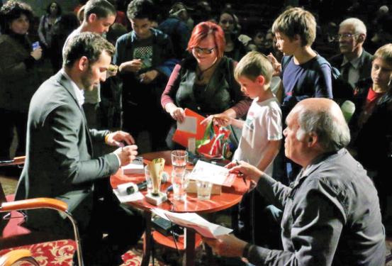 Szilágy Áron elmondta, hogy nem először jár a kerületben, hiszen 2011-ben már meghívták a Móra Ferenc Általános Iskolába, 2014-ben a Baráti Kör vendége is volt, tavaly pedig részt vett az új vívó-, birkózó- és szumócsarnok átadóján is, sőt, a Kertvárosi Vívó Sport Egyesület (KVSE) edzésein is részt szokott venni. Mindig szívesen jön a Kertvárosba, és habár a riói eseményekről már sokszor, sok helyen beszélt, boldogan tett eleget a meghívásnak most is, a kétszeres olimpiai bajnok ugyanis úgy érzi, hogy annyi pozitív dolog történt vele az elmúlt egy év során, amelyekért nem lehet elég hálás. Ahogy azért sem, hogy 26 évesen ő vihette a nyitó napon a magyar csapat olimpiai zászlaját, győzelmével pedig sikerült megtörnie egy 1948 óta fennálló pechszériát, amely a zászlóvivőket sújtotta. Mindezek mellett elmesélte azt is, hogy mielőtt pástra lépett volna, újra megnézte felvételről a bevonulást, amely csak tovább erősítette pozitív hozzáállását.