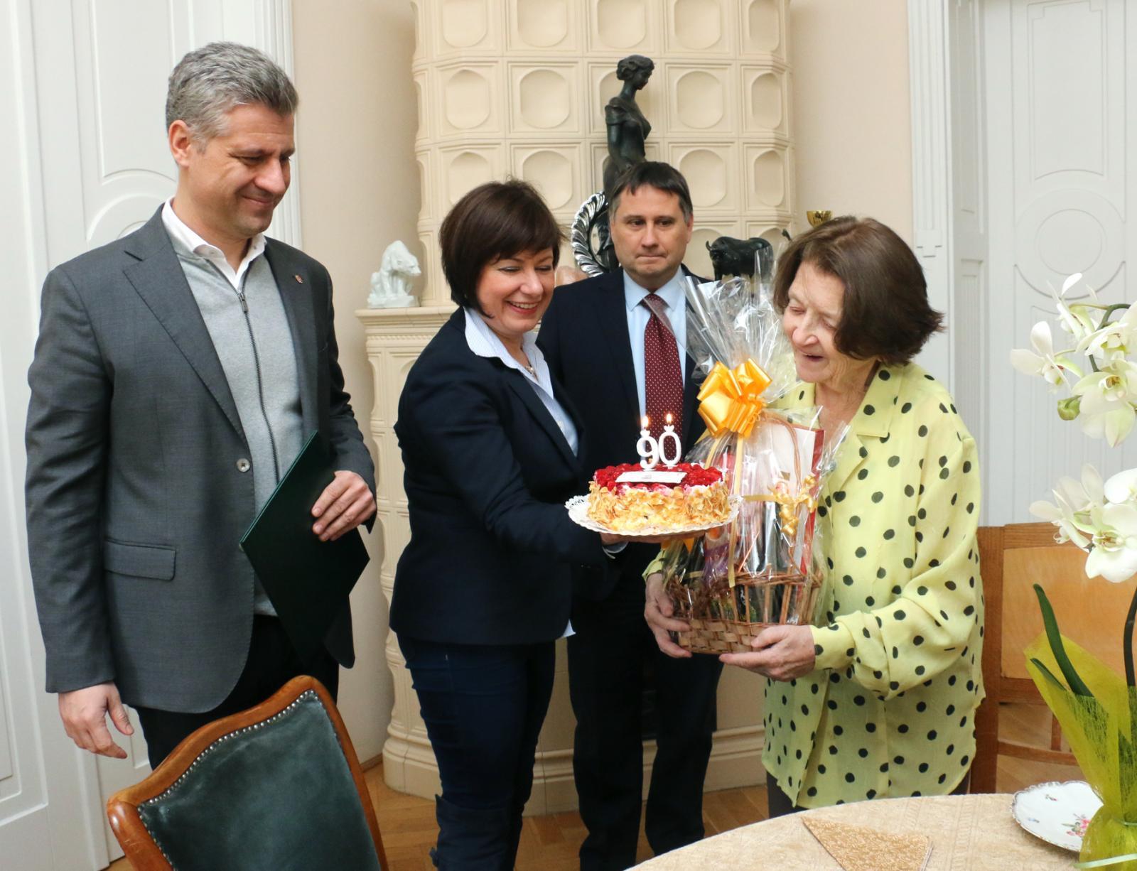 Bobok Endrénét 90. születésnapja alkalmából Szatmáry Kristóf országgyűlési képviselő, Kovács Péter polgármester és Ács Anikó, a körzet önkormányzati képviselője köszöntötte.